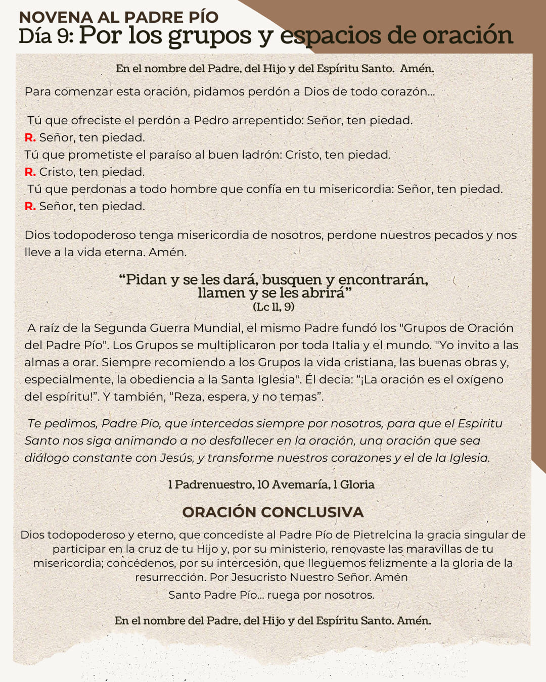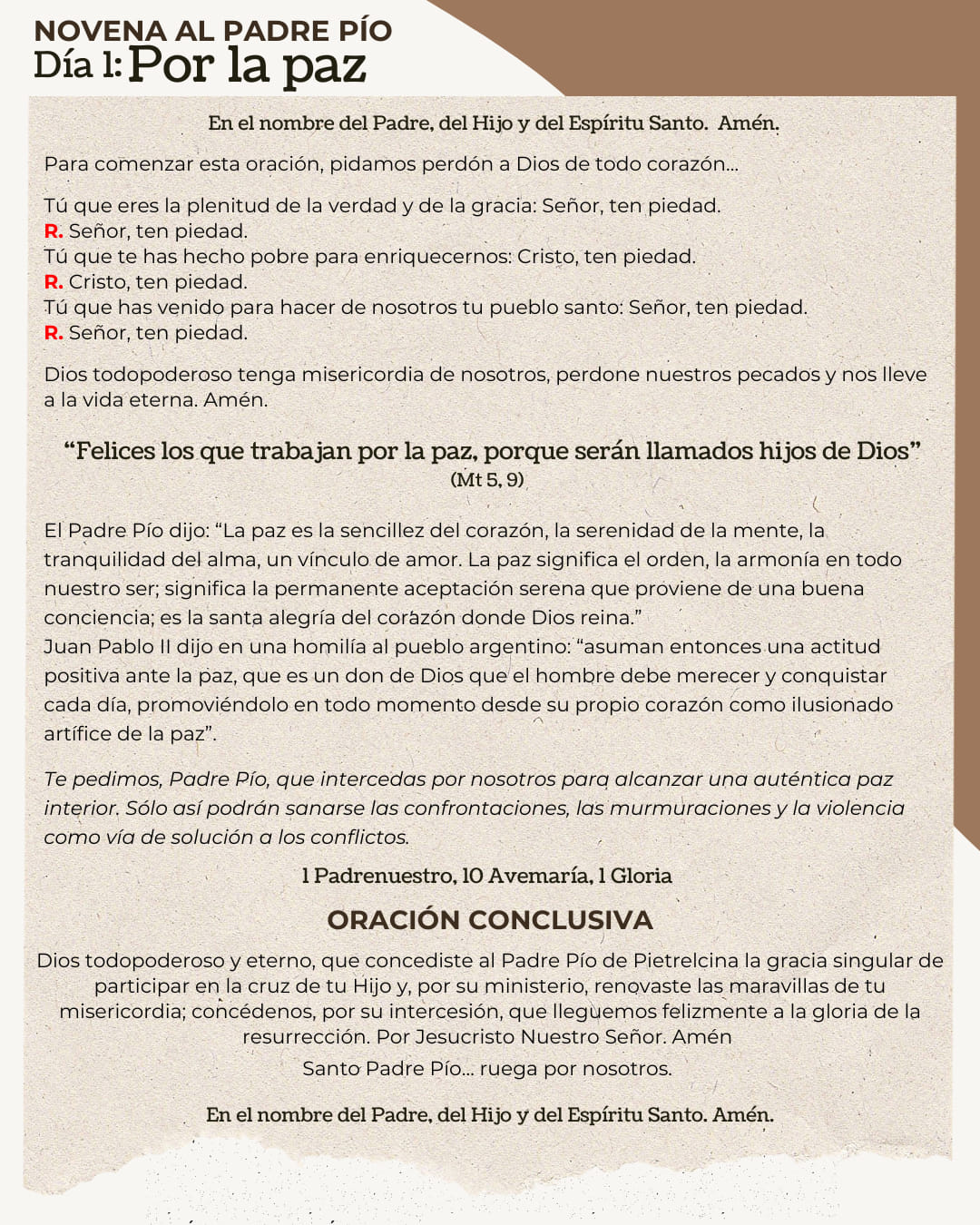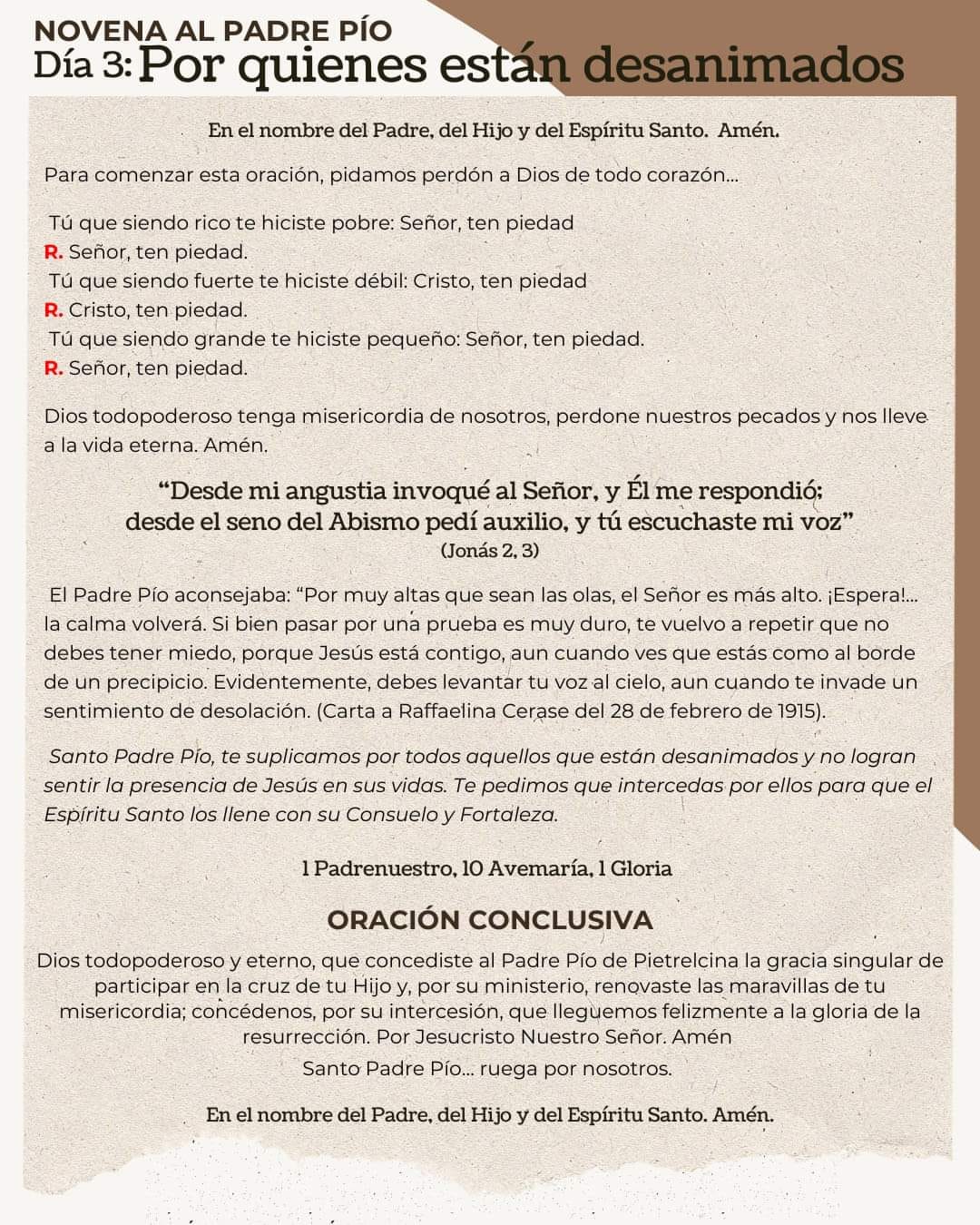 Señor, te pido la conversión de los que, como yo, son pecadores. Quiero unirme, junto al Santo Padre Pío, a tu deseo de salvación universal, solidarizándome con mis hermanos y emprendiendo con ellos un camino de sincera conversión. Dame la gracia de cumplir tus mandamientos alimentando al hambriento, dando de beber al sediento, vistiendo al desnudo, alojando al forastero, visitando al enfermo y al encarcelado, descubriéndote y respetándote en la obra de tus manos. Cambia mi forma de pensar y de sentir, porque muchas veces no parezco hijo tuyo. Y permíteme disfrutar al final de los tiempos del banquete que tienes preparado no sólo para los que te conocen y sirven, sino también para aquellos que no han tenido esa gracia y que, a pesar de no saberlo, también son hijos tuyos. Amén.
