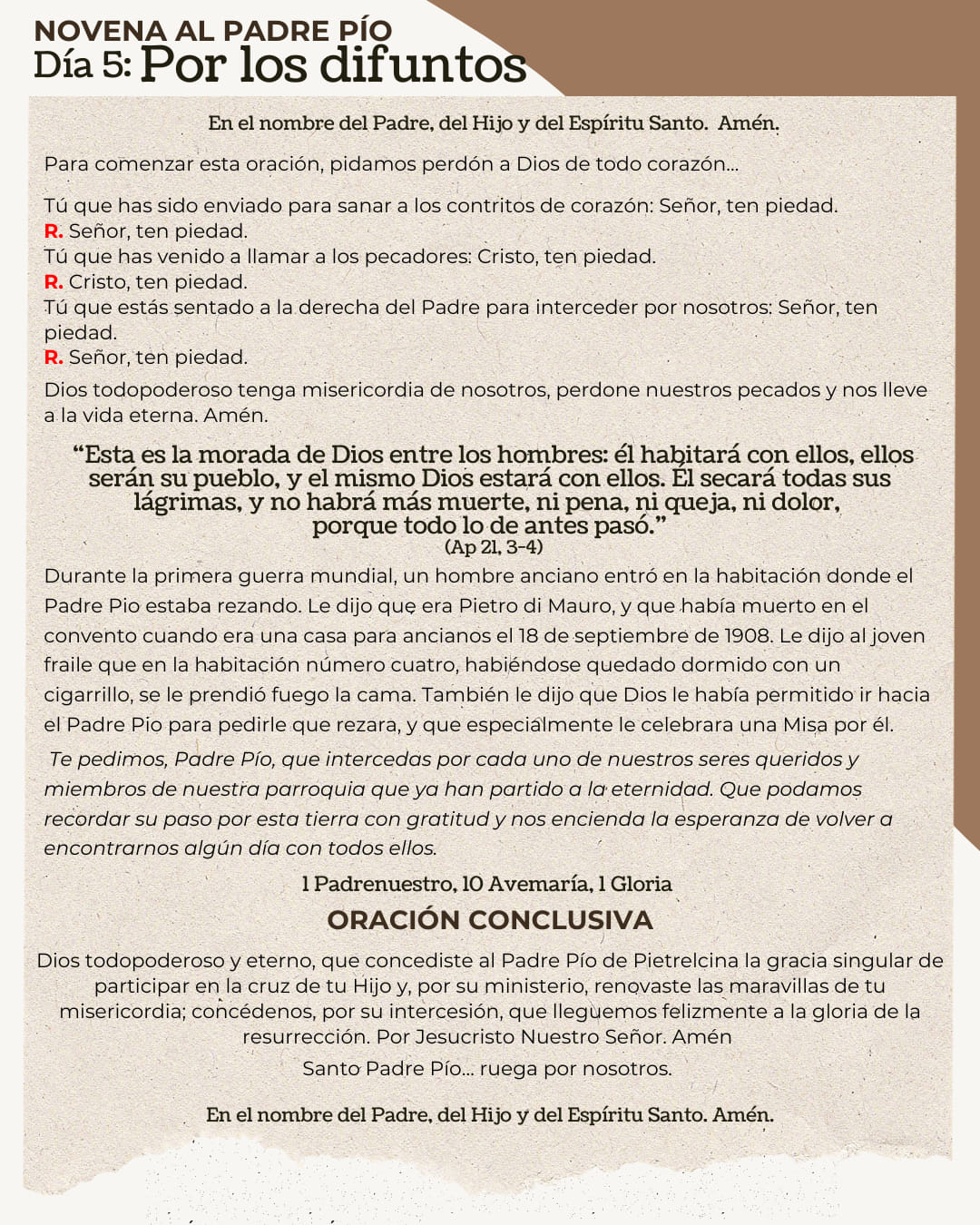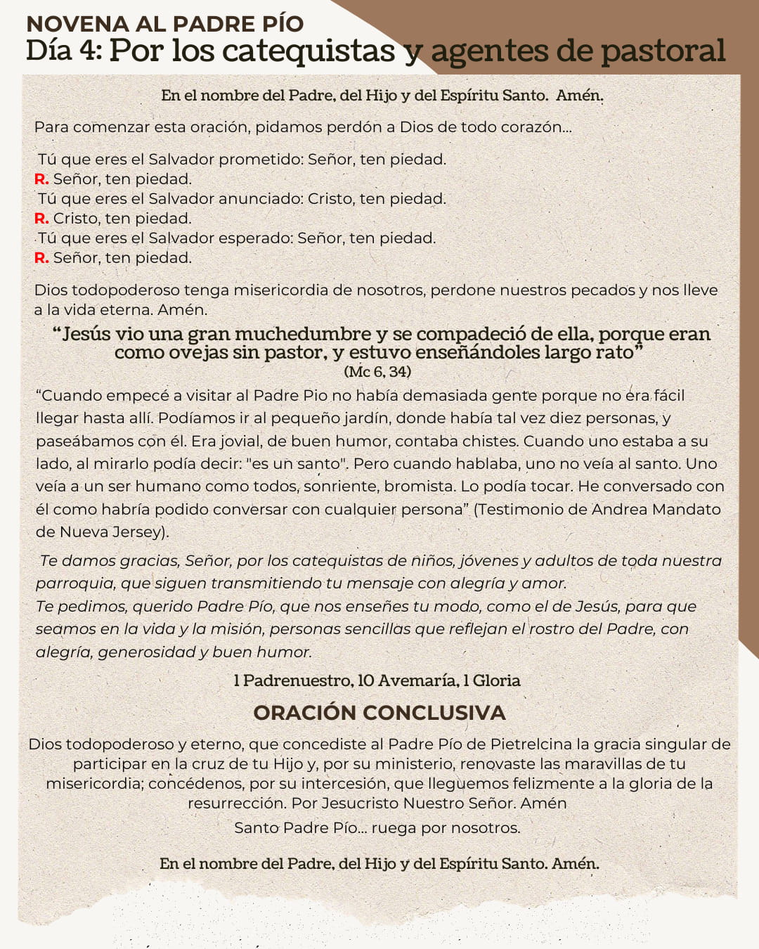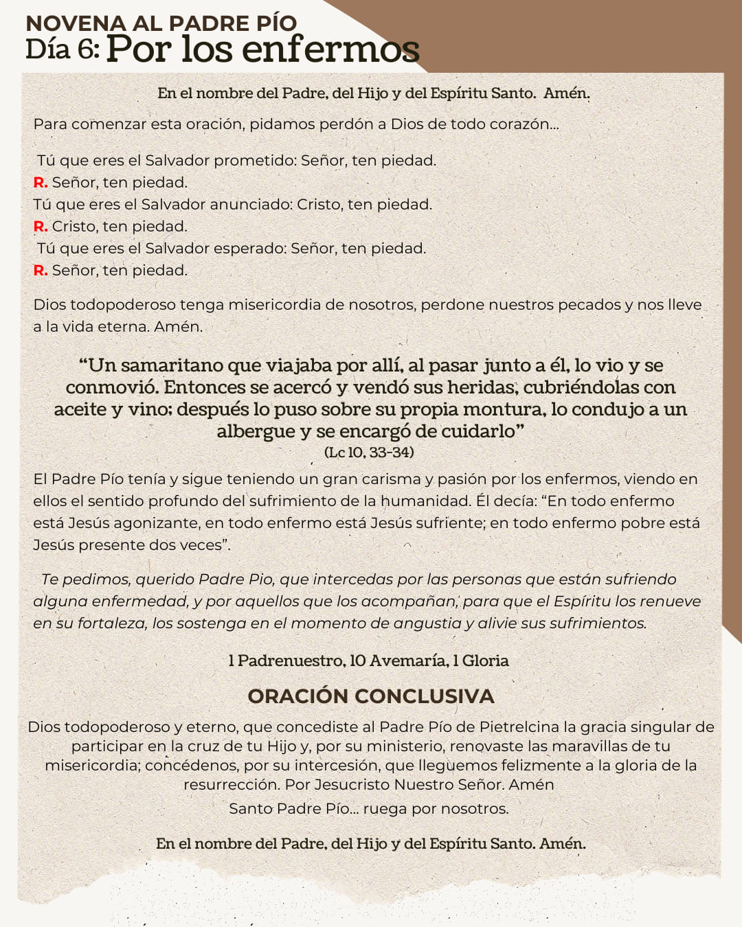 Señor, te pido la conversión de los que, como yo, son pecadores. Quiero unirme, junto al Santo Padre Pío, a tu deseo de salvación universal, solidarizándome con mis hermanos y emprendiendo con ellos un camino de sincera conversión. Dame la gracia de cumplir tus mandamientos alimentando al hambriento, dando de beber al sediento, vistiendo al desnudo, alojando al forastero, visitando al enfermo y al encarcelado, descubriéndote y respetándote en la obra de tus manos. Cambia mi forma de pensar y de sentir, porque muchas veces no parezco hijo tuyo. Y permíteme disfrutar al final de los tiempos del banquete que tienes preparado no sólo para los que te conocen y sirven, sino también para aquellos que no han tenido esa gracia y que, a pesar de no saberlo, también son hijos tuyos. Amén.