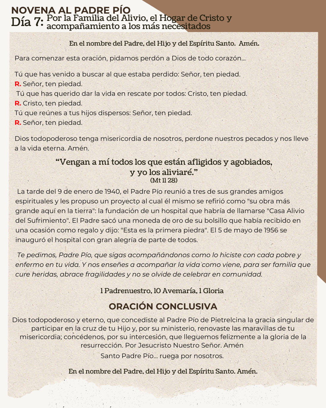 Padre Pío, tú viviste en el siglo del orgullo, y fuiste humilde. Padre Pío, tú pasaste entre nosotros en la época de las riquezas soñadas, jugadas y adoradas, y permaneciste pobre. Padre Pío, junto a ti ninguno oía la Voz, y tú hablabas con Dios. Cerca de ti ninguno veía la Luz, y tú veías a Dios. Padre Pío, mientras nosotros corríamos afanosos, tú te quedabas de rodillas y veías el Amor de Dios clavado a un Madero, herido en las manos, en los pies y en el corazón, para siempre! Padre Pío, ayúdanos a llorar delante de la Cruz, ayúdanos a creer delante del Amor, ayúdanos a sentir la Misa como llanto de Dios, ayúdanos a buscar el perdón como abrazo de paz, ayúdanos a ser cristianos con las heridas que derraman sangre de caridad fiel y silenciosa, como las heridas de Dios! Amén.