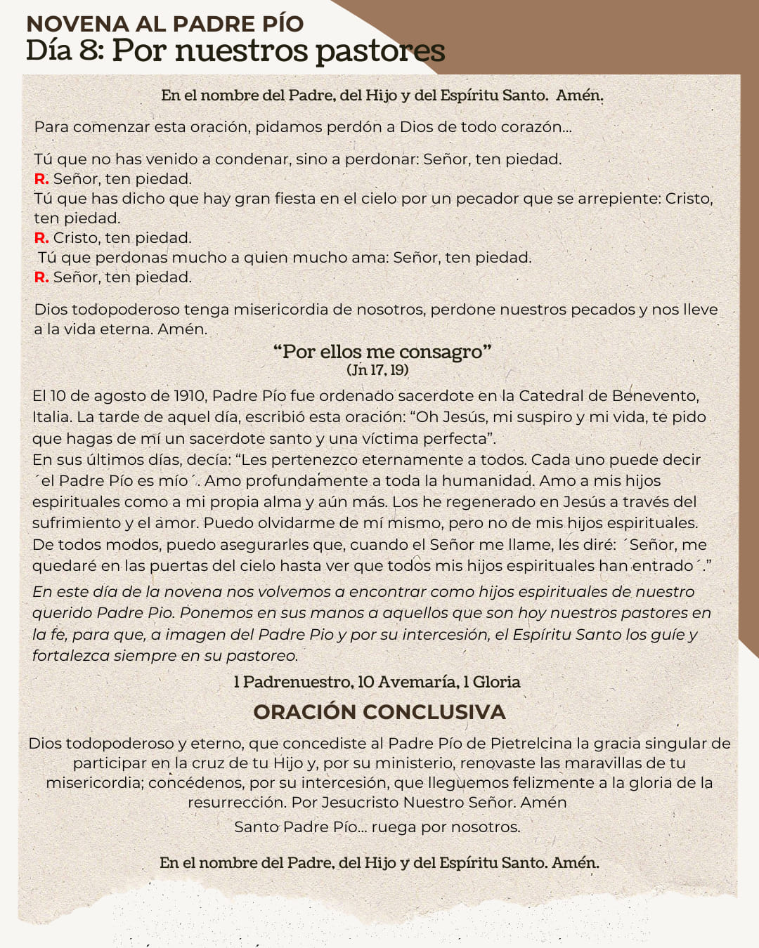 Te consagro mis fuerzas y mis límites: tómame como soy y haz de mí como hiciste de Pío de Pietrelcina, un buen cristiano y un honrado ciudadano que te alabe sirviendo a mis hermanos. Amén.